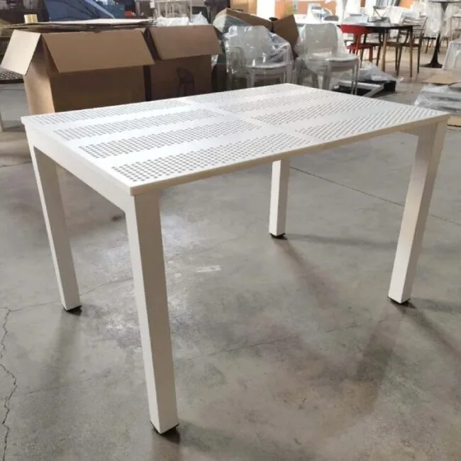 Bàn nhựa chữ nhật có đục lỗ với thiết kế đơn giản mà hiện đại. Bàn phù hợp với nhiều loại ghế ăn, ghế cafe. Chất liệu của bàn bao gồm mặt chữ nhật đúc từ nhựa PP nguyên sinh, và chân sắt sơn tĩnh điện. Có hai loại kích thước để lựa chọn là khổ dài 1,2m và khổ 1,8m. Đặc biệt mặt bàn được làm nhựa polypropylene có đục lỗ. Nên chiếc bàn này có thể để ở ngoài những khu vực nhạy cảm với ánh sáng mặt trời hoặc có một chút nước mưa hắt vào.